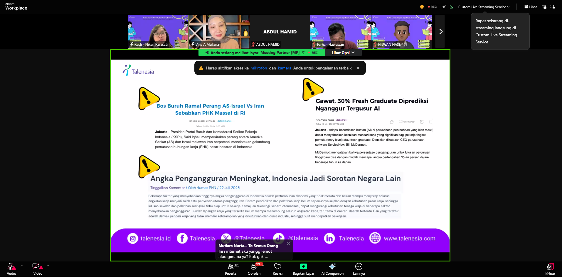 JEMBER – Sebanyak 745 peserta dari berbagai daerah mengikuti Webinar Nasional yang diselenggarakan secara daring melalui Zoom pada Rabu (25/3/2026) pukul 19.00–21.00 WIB. Kegiatan yang diinisiasi oleh Talenesia ini mengangkat tema “Sudah Lamar Banyak, Tapi Belum Tembus? Realita Dunia Kerja dan Cara Dapat Kerja di Tengah Persaingan Ketat.”